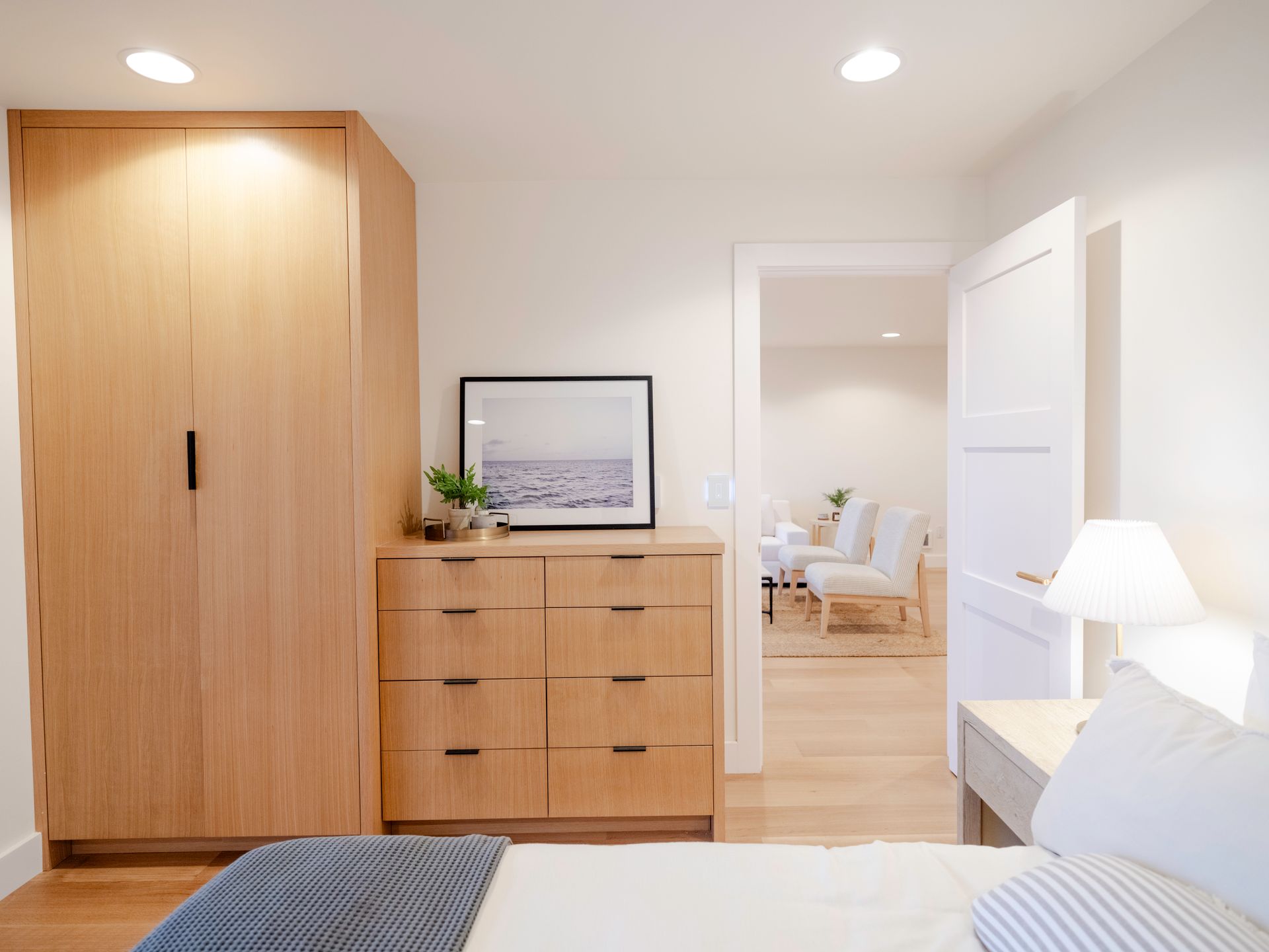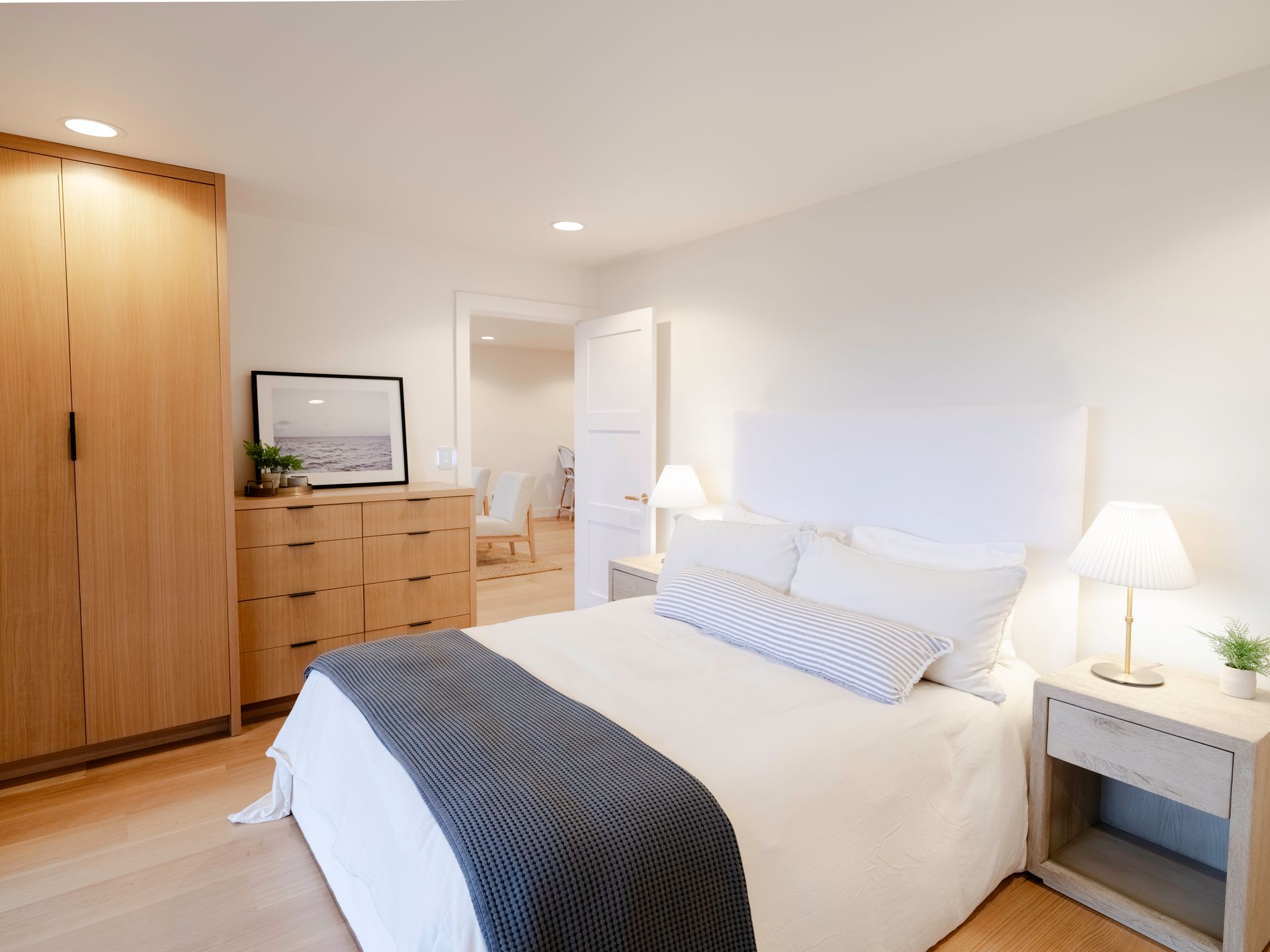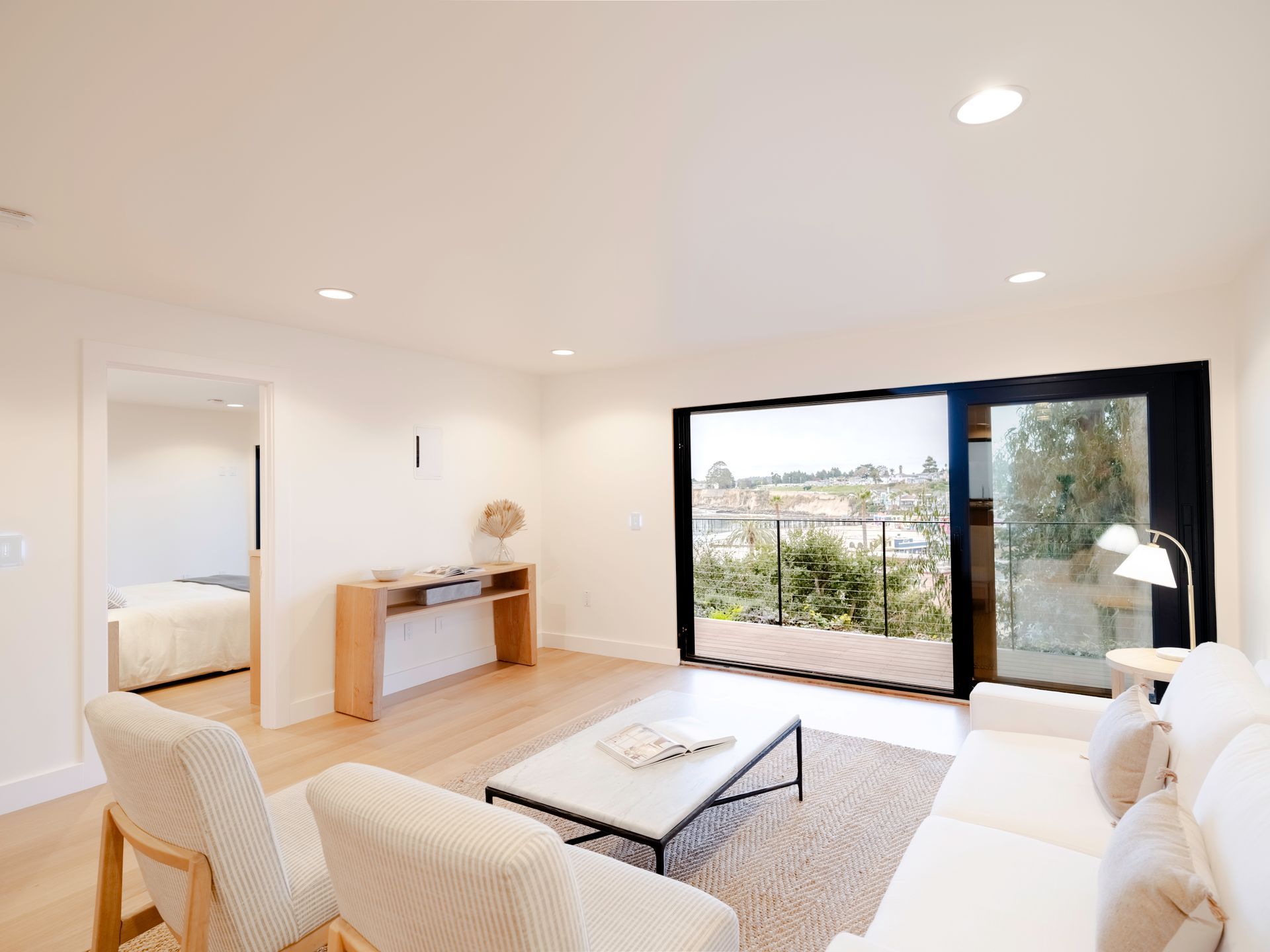 This elegant residence features an open layout with a spacious living room, modern kitchen, and a primary bedroom offering sweeping ocean views. The bedrooms are thoughtfully separated by well-appointed bathrooms, ensuring privacy and comfort while maintaining a seamless flow throughout the space.